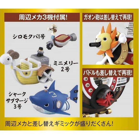 The Land of Wano arc version of the Thousand Sunny from ONE PIECE will be available as a plastic model kit! Newly designed marking stickers and water decals to recreate the damage the ship suffered when it snuck in are included. Newly designed figures of all nine of the Straw hat Pirates in their Land of Wano arc attire are also included! Accessories include White hobby horse No1, Mini Merry No2, Shark Sumberge No. 3, and display base. Interchangeable parts are available to recreate Gaon Cannon and paddles on the side of the ship.